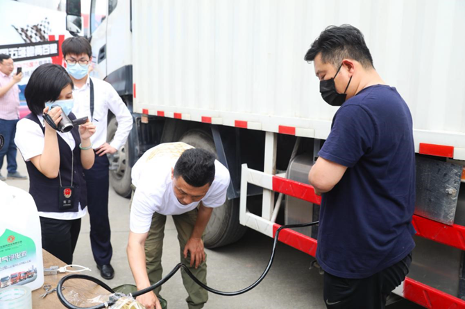 最终,挑战车辆于3月29日顺利抵达终点,下午3点,活动收官仪式如期举行。公证处公证人员、权威媒体、百万级卡车网红“安徽宏姐”等嘉宾悉数到场,随后,工作人员取出油箱钥匙,开箱抽油,进行油耗测算。令人意外和惊喜的是,箱内燃油剩余非常多,工作人员足足抽了十几分钟,才将剩余燃油全部抽出。