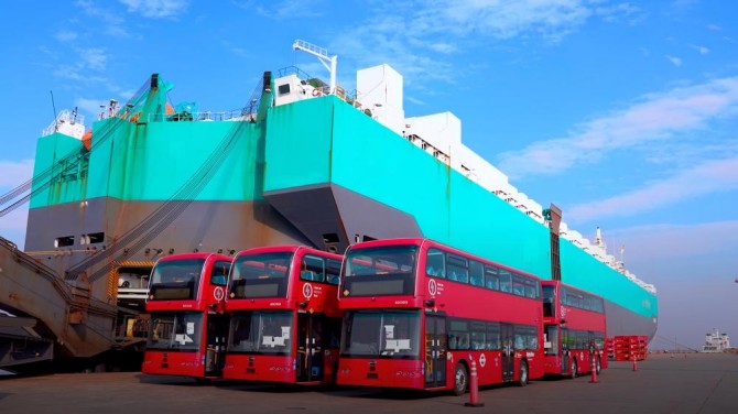 比亚迪双层大巴在港口集结装船