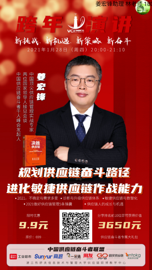 1月28日晚,中国顶尖供应链管理实战专家、价值链研习社创始人姜宏锋老师(公众号:姜宏锋决胜供应链)跨年演讲在线上如期举行,此次演讲以《规划供应链奋斗路径 进化敏捷数智协同系统》为主题,吸引了全国6000+优秀供应链奋斗者的关注(回放:https://appratdbz0t5931.h5.xiaoeknow.com/v1/course/alive/l_600e950de4b0d0af0d8e78dd?type=2)