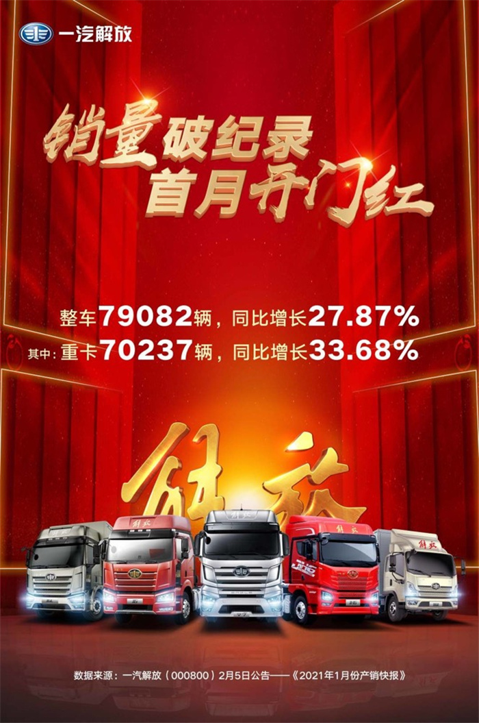 2月5日晚,一汽解放发布了2021年1月份产销快报,全月共销售整车7.91万辆,同比增加27.87%,其中,重卡销售7.02万辆,同比增加33.68%,打破了重卡月销量的历史记录。2021第一战,解放战的豪迈,赢得漂亮!