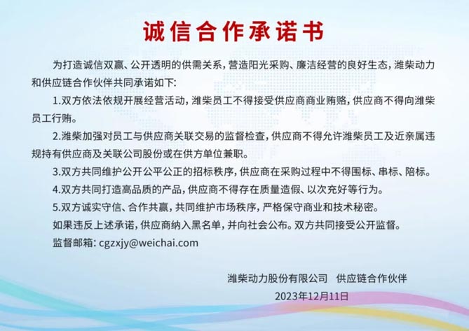 12月11日,潍柴动力全球供应链战略合作伙伴大会在海南海口隆重举行。会上,谭旭光提出携手打造公平竞争、阳光透明、廉洁干净的全球供应链“朋友圈”,联合所有供应商齐声向社会发出了诚信合作的郑重承诺。潍柴动力CEO、总经理王德成与10家供应商代表签订诚信合作承诺书。