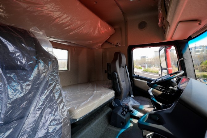 驾驶室内采用150mm低鼓包设计,中部站立高度达1850mm,让驾驶员在车内活动自如。880mm超宽卧铺,为长途奔波的驾驶员提供舒适的休息空间。环绕式仪表台让各类按键触手可及,换挡杆集成优化至仪表台,彻底释放主副驾之间的通道空间。7寸液晶仪表搭配可选装的10寸多媒体大屏(集成四方位影像),行车信息一目了然。标配气囊座椅可选通风加热及三级气动腰托功能,无论酷暑寒冬都能提供舒适的乘坐体验。